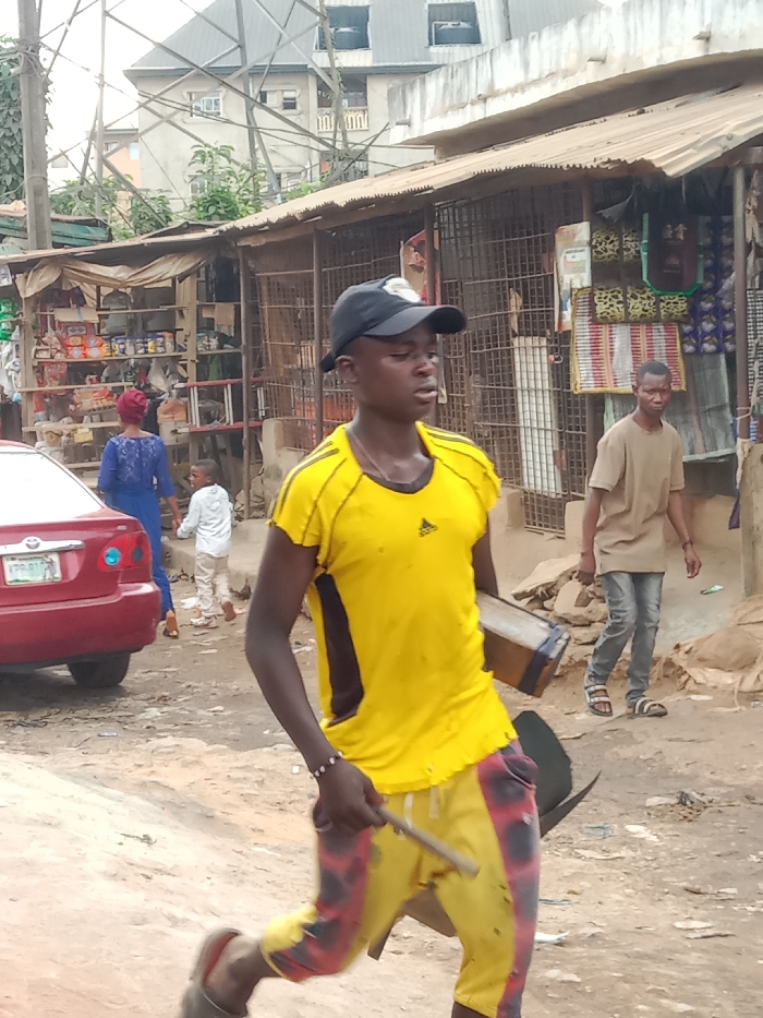 This image captures a daytime street scene in Onitsha, Nigeria, characterized by a busy, unpaved urban environment with informal market structures. In the foreground, a young male of dark complexion walks towards the right. He wears a black baseball cap backward, a tattered yellow short-sleeved Adidas t-shirt, yellow and black/red tie-dye patterned capri-length shorts, and dark brown slide sandals. A beaded bracelet is visible on his left wrist. He holds a rectangular, light-colored wooden object (possibly a drum or box) under his left arm and a wooden stick in his right hand. His gaze is directed forward. Behind him, on the left, the rear of a red sedan, bearing Nigerian license plate "KPP-81GY," is parked or moving slowly. Further left, a woman in a royal blue dress and red headscarf, and a young child in a white shirt and light-colored pants, walk away from the camera. The right side of the scene is dominated by a row of makeshift market stalls with corrugated metal roofs. The first visible stall, behind the red vehicle, displays various packaged goods on shelves. The subsequent stalls have grated or barred fronts, with some merchandise, including patterned fabric, hanging. In the mid-background, to the right of the central figure, another male walks leftward, wearing a light brown t-shirt, light blue jeans, and sandals. The ground is unpaved, appearing as dirt or mud. In the background, behind the market stalls, multiple multi-story buildings are visible under an overcast sky, one featuring a grey, angled roof. A metal framework structure, possibly for utility lines, is present on the far left.