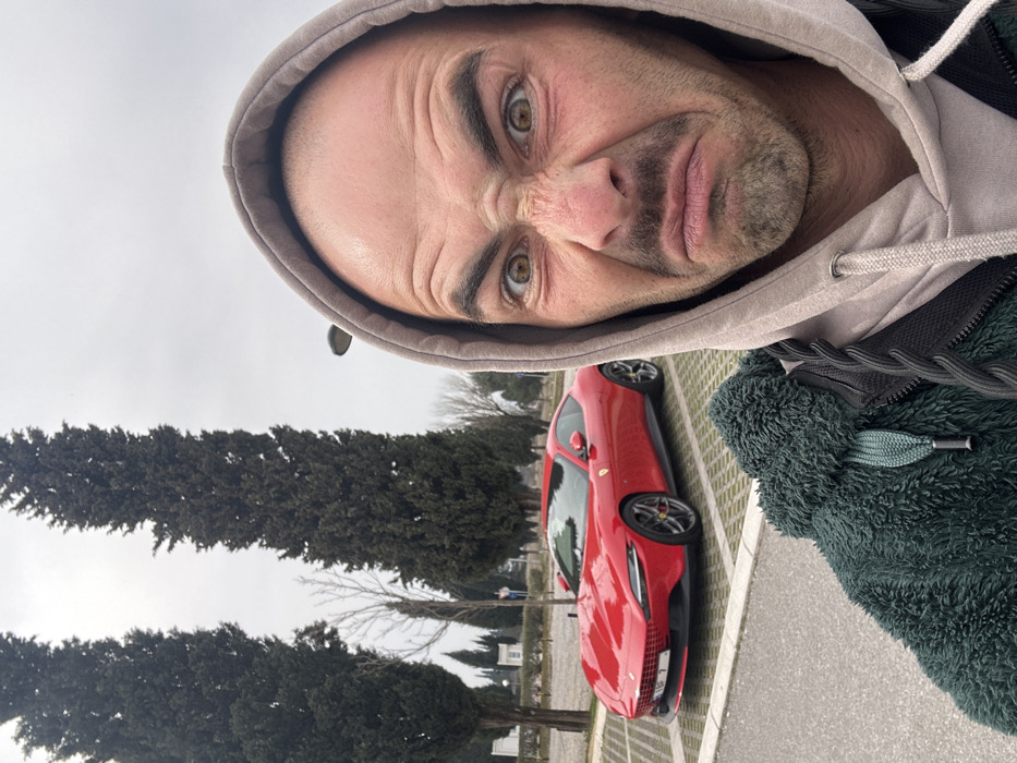 A male individual is captured in a close-up selfie, standing in a paved parking lot in Golubovci, Montenegro, under an overcast sky. He wears a light beige hooded sweatshirt layered under a dark green, textured jacket. His face is contorted in a humorous grimace, with wide eyes, a wrinkled nose, and pursed lips. Behind him, a bright red Ferrari Roma sports car is parked diagonally in a designated space, revealing a partial Montenegro license plate "PG 7" on its front bumper. The background features several tall, slender, dark green coniferous trees, alongside some bare deciduous trees. In the far distance, white structures indicative of a cemetery or memorial site are visible. A street light pole is also present in the upper right background.