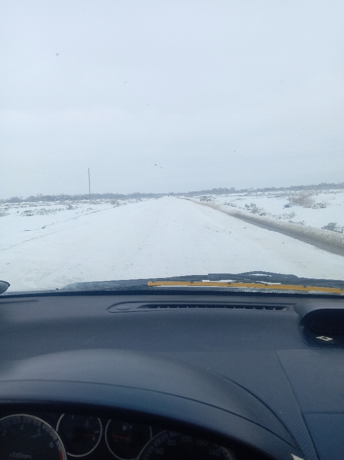 The image depicts a forward view from inside a vehicle, presenting a snow-covered rural or remote landscape under an overcast sky in Unknown, Unknown