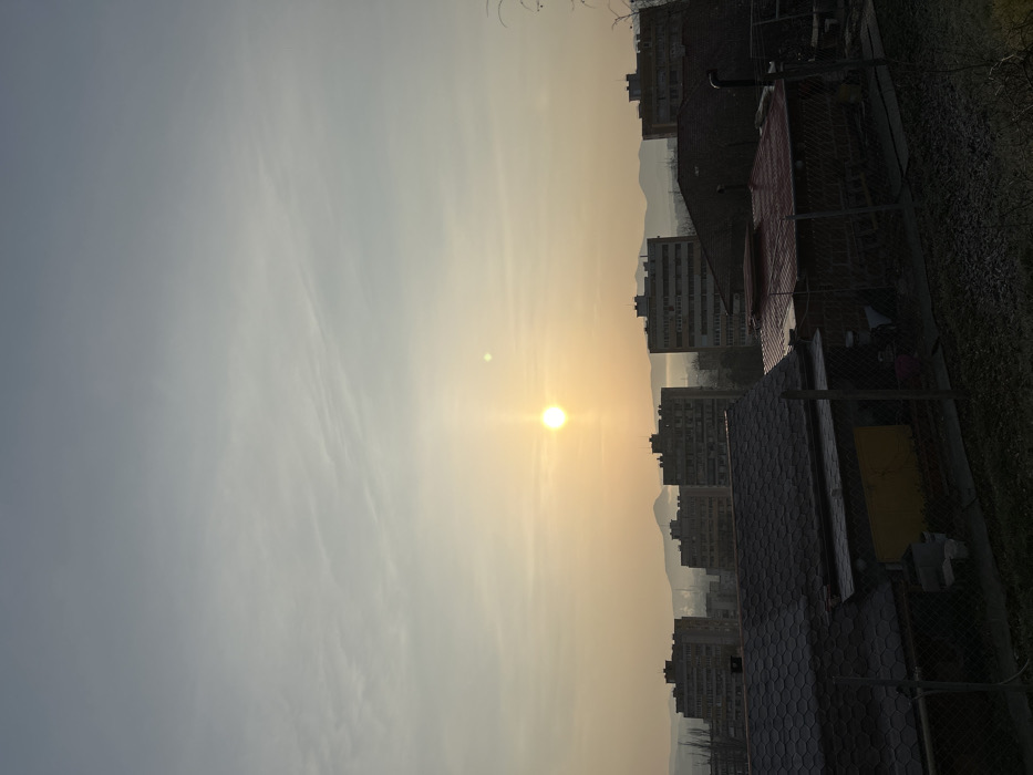 The image depicts an urban landscape in Kardzhali, Bulgaria, captured during either sunrise or sunset, indicated by the low angle and warm tones of the sun. The sky occupies the upper two-thirds of the frame, transitioning from a bright, hazy yellow near the horizon and sun to a pale blue-grey in the upper reaches. Faint, wispy cloud formations are visible in the upper sky. The sun, a distinct bright yellow orb, is positioned slightly to the left of the vertical center, exhibiting prominent vertical and horizontal lens flare streaks and a secondary, less intense ghosting artifact to its upper right. In the foreground, a dark, uneven terrain covered with sparse, indistinct vegetation runs along the bottom. A chain-link fence, appearing aged or discolored, stretches horizontally across the lower mid-frame. Behind this fence, two primary small structures are visible. The structure on the left features a dark, patterned roof and a partially obscured, lighter-colored wall. The structure to its right has a reddish, possibly tiled, roof with a dark ventilation pipe extending vertically. Additional smaller, dark structures are partially visible behind these foreground buildings. The midground is dominated by at least six multi-story, rectangular apartment buildings. These structures, uniform in a utilitarian architectural style and appearing in muted grey or beige tones, are silhouetted against the brighter sky while retaining some discernible window details. In the distant background, a range of low-lying hills or mountains is faintly visible through the atmospheric haze along the horizon line. No people, discernible actions, or interactions are present in the scene.