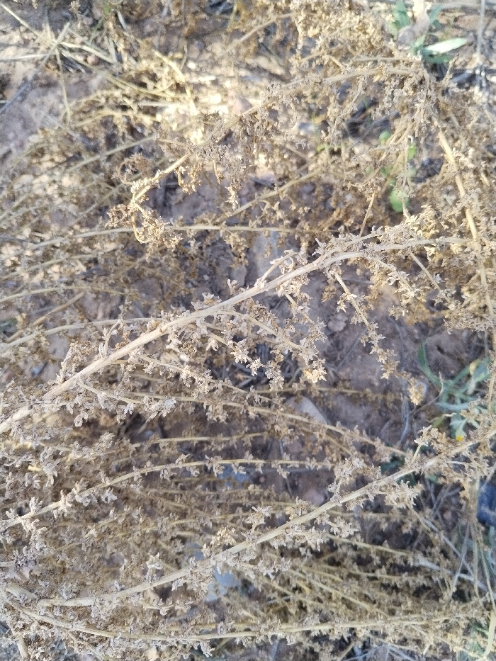 The image displays a close-up, high-angle view of dry, light-brown vegetation covering a sandy-brown ground. The dominant subject is a dense layer of intertwined, brittle stems with numerous small, shriveled seed pods or floral remnants, suggesting a state of desiccation. The underlying ground, visible in patches, consists of dry earth with some scattered debris. Faint, out-of-focus green foliage is discernible in the background. The scene is illuminated by natural light, indicating an outdoor environment in Torre Pacheco, Spain. No individuals or animate subjects are present, and no active interactions are depicted.