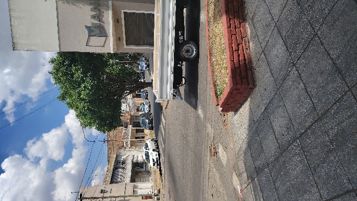 A residential street with sidewalks and a tree. Buildings of varying heights line the left side, with power lines visible against a blue sky with clouds. Cars are parked along the street. A truck with a flatbed is parked along the curb. Sidewalks with brick borders edge the roadway.
