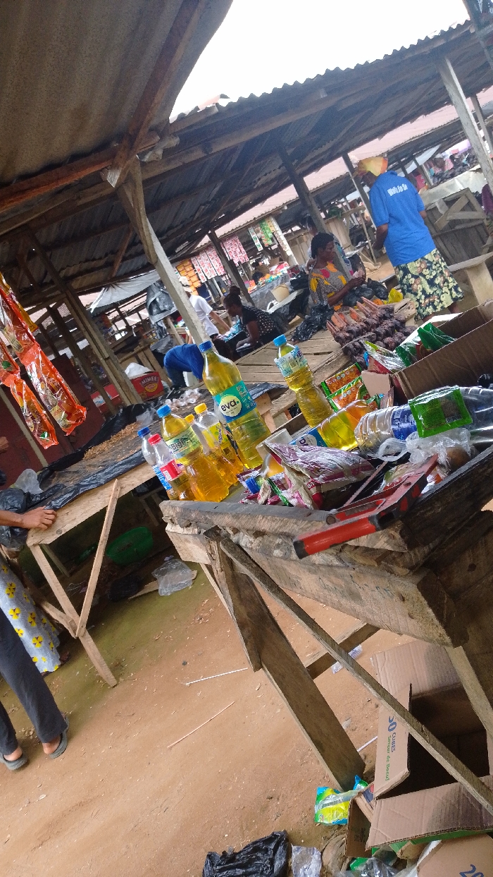 The image depicts an active, open-air market in Unknown city, Unknown country, under an overcast sky. The environment consists of numerous rustic stalls constructed from wooden frames and corrugated metal roofs, set on an uneven reddish-brown dirt ground. In the foreground to the right, a wooden stall is laden with merchandise. Multiple plastic bottles containing a yellow liquid, identified as cooking oil (one "Eva" brand bottle is clearly visible), are displayed alongside various packaged snack items and small plastic bags. Several empty cardboard boxes, one marked "30 CUBES," are also present. A red-handled implement, possibly a brush, lies on the stall. To the far left, the lower legs and feet of an individual wearing dark pants and open-toed sandals are visible, standing near another stall from which multiple brightly colored packaged goods hang. In the midground, a woman with darker skin, wearing a colorful patterned blouse, is seated behind a wooden stall covered with a dark plastic sheet. On this stall, rows of skewered items, consistent with dried fish or meat, are displayed. She appears to be attending to her merchandise. To her right, another woman with darker skin stands with her back partially to the camera, wearing a blue t-shirt with white text (partially legible, possibly "Walk, Go Go") and a floral skirt. Her head is covered with a yellow headwrap. She appears to be observing or interacting with the seated vendor or the goods on display. In the background, additional market stalls and blurred figures of other individuals indicate ongoing commercial activity within the market structure. Debris, including plastic bags and wrappers, is scattered on the ground and around the stalls.