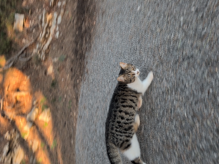 - "The image depicts a domestic tabby and white cat in motion on an asphalt or paved path in Petrovac na Moru, Montenegro" by FM-5itlR2, licensed under CC BY 4.0
