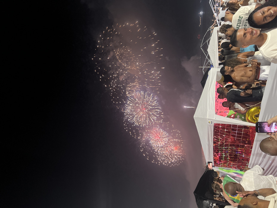 Fireworks illuminate the night sky near a gathering of people. Many are dressed in white. Some stand beneath white tents decorated with red fringe. Individuals are taking photos. A man smiles into the camera, while a woman tilts her head to the side, also smiling. The festive scene suggests a celebration.