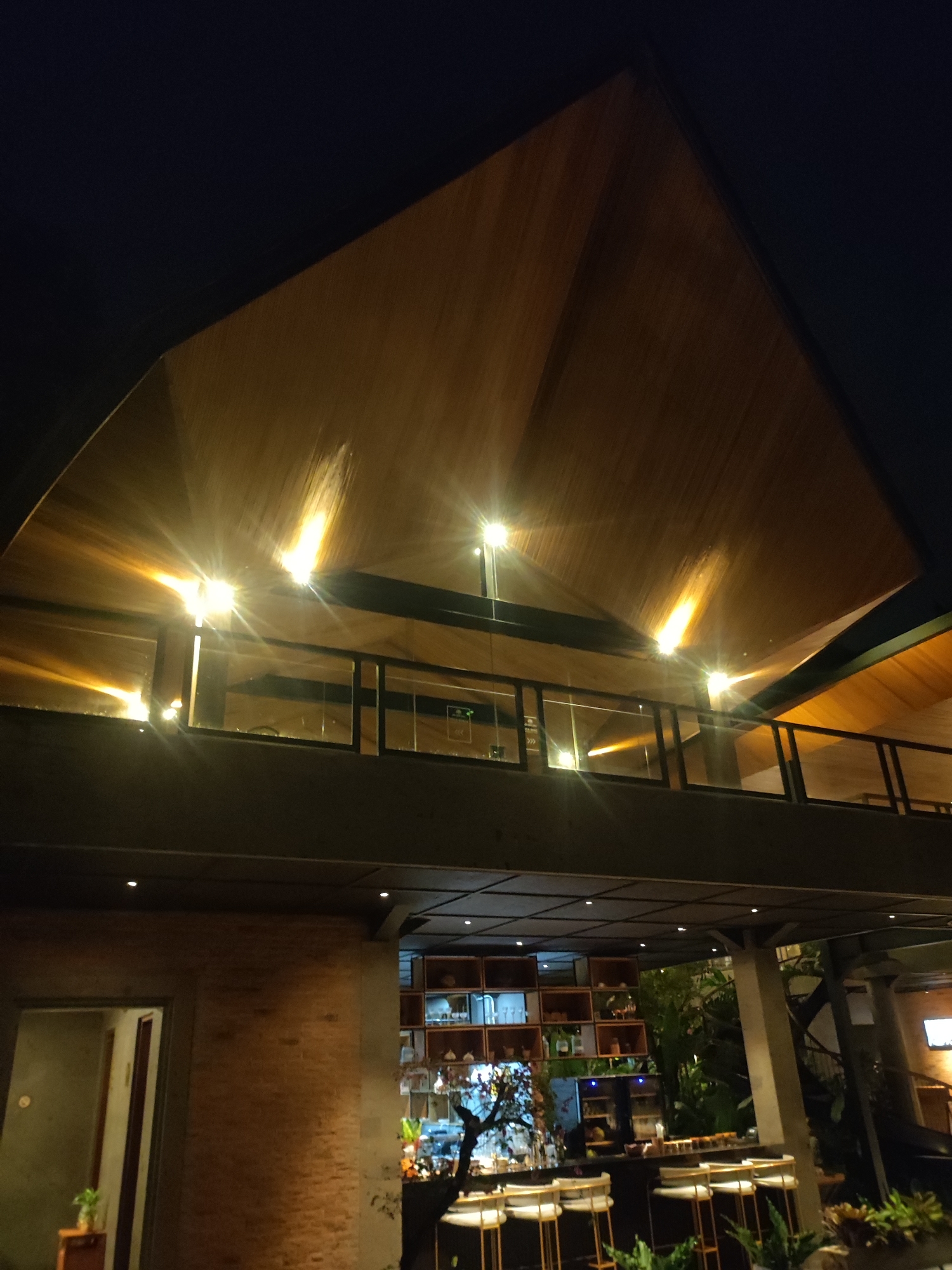 The image depicts the exterior of a modern, multi-level building at night, located in Mas, Indonesia. The upper section features a distinctive pitched roof with light-brown wood paneling illuminated by multiple warm-toned lights, creating starburst lens flare effects. A second-story balcony or mezzanine level is visible, enclosed by clear glass panels with black frames and a dark railing. The lower section of the building includes a brick-clad wall on the left, adjacent to an open doorway revealing a dimly lit interior. To the right, a ground-floor bar area is present, featuring a dark counter and several light-colored bar stools with metallic bases. Behind the bar, a wooden shelving unit displays bottles and glasses. Green foliage is visible around the bar, and a dark, stylized tree-like object stands on the counter. The overall environment is characterized by contemporary architecture and artificial illumination against a dark night sky. No individuals are visible.