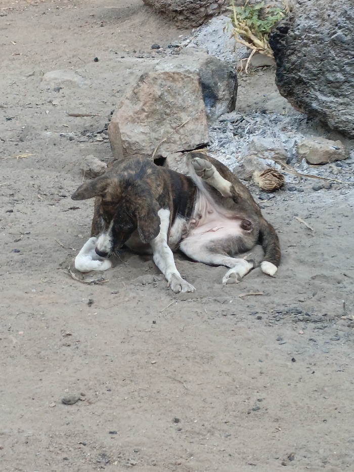 - "A brindled dog with white markings on its chest, belly, and paws is observed lying on its left side on a dirt ground in Akwanga, Nigeria" by FM-5D8LB2, licensed under CC BY 4.0