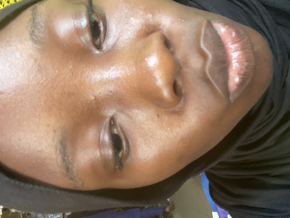 The image presents a close-up frontal portrait of an individual in Lokoja, Nigeria, focusing on the head and upper torso. The subject has medium-dark skin and wears a black head covering, likely a hijab, which frames the face. The eyes are downcast. The skin exhibits a glossy sheen, particularly on the forehead and nose, with several small dermal imperfections visible on the forehead, nose, and cheeks. The lips are full, slightly parted, and appear reflective. The background is blurred, revealing a partially visible person in blue attire on the left and indistinct environmental elements, consistent with an indoor or semi-enclosed setting.
