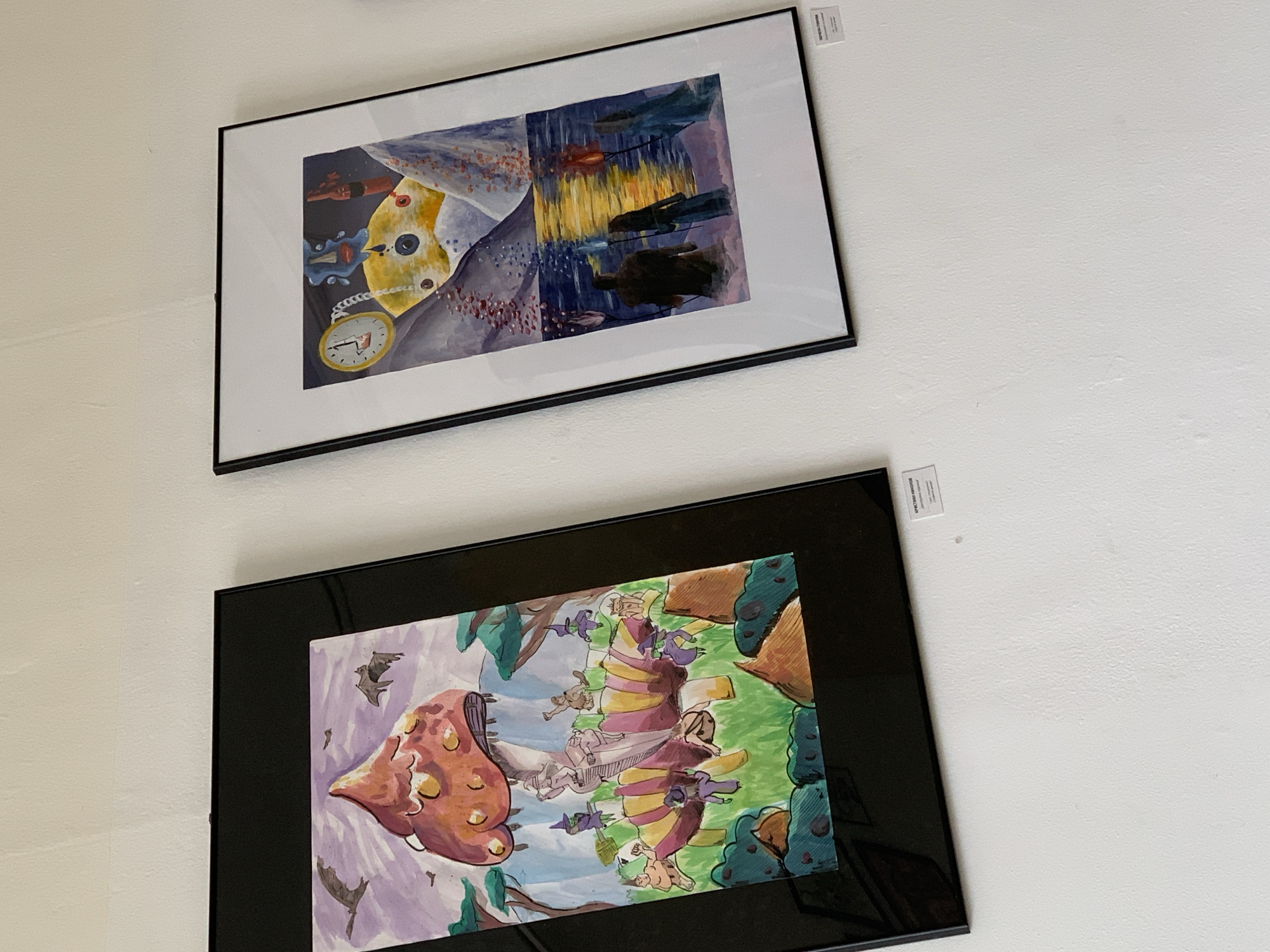 Two framed watercolor paintings are hanging on a white wall. The top painting features a clock with a chain, a landscape, and silhouettes of objects. The bottom painting depicts a mushroom, a building structure, and people in a landscape setting. The image was taken at an art gallery in Sofia, Bulgaria.