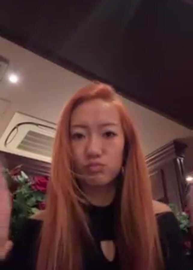 A woman with long red hair sits facing the camera in what appears to be a restaurant