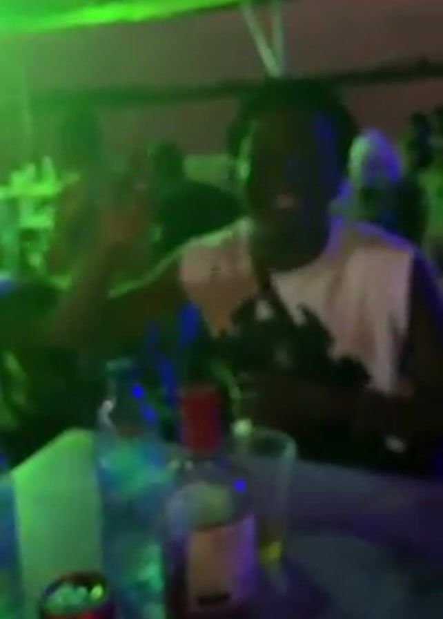 group of people in an indoor, brightly lit space, possibly a bar or club, with green and blue lights illuminating the scene. One individual in the foreground, wearing a white shirt with a black design and a dark crossbody bag, is looking towards the camera and making hand gestures. On the table in front of him are several bottles, including what appears to be a bottle of alcohol, a clear water bottle, and a red can. Other individuals are visible in the background, moving and socializing. The overall atmosphere suggests a lively, social gathering.