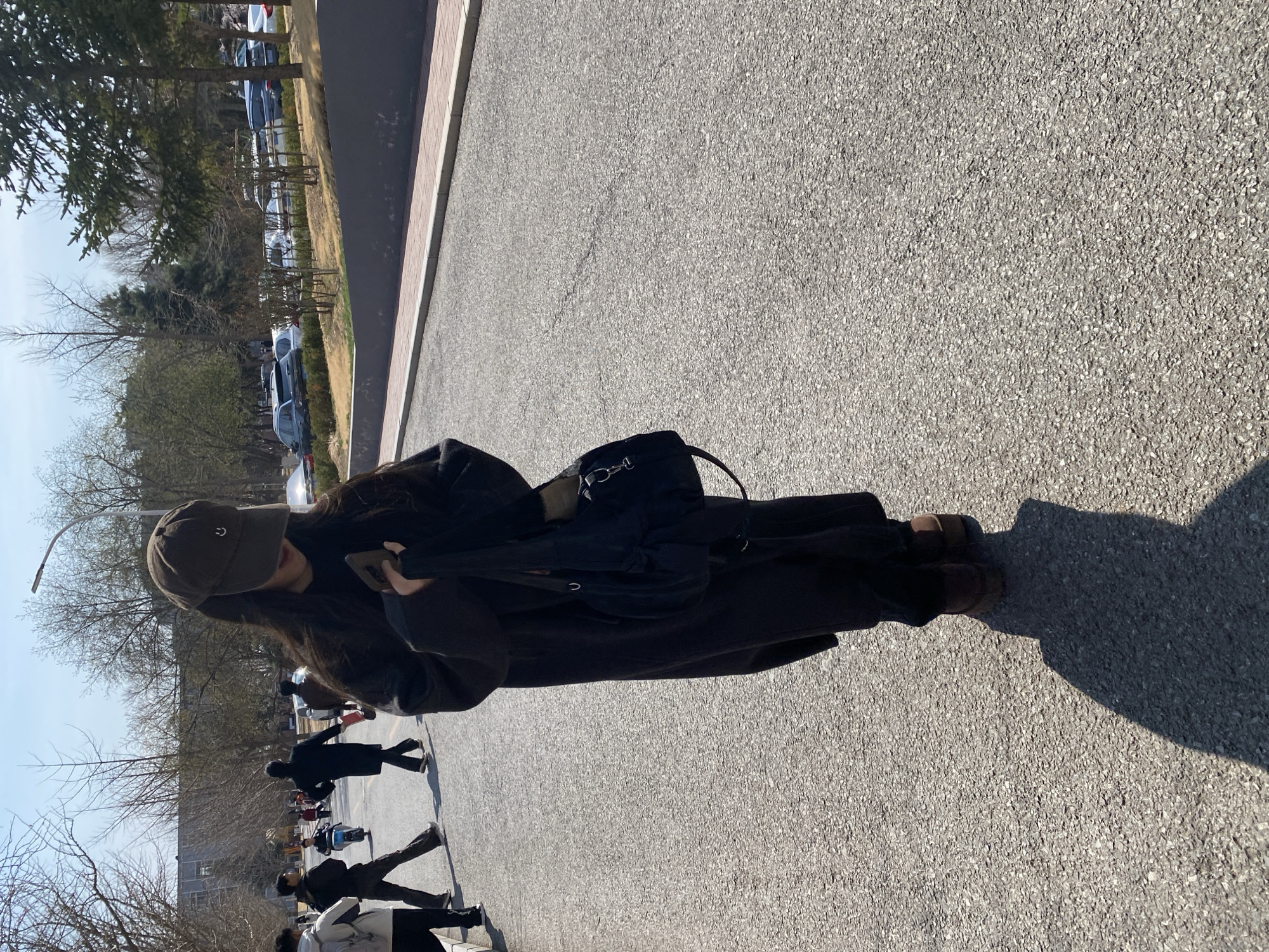 A woman stands on an asphalt surface. She is wearing dark clothing, a dark coat, dark pants, and dark shoes. She is also wearing a dark hat. She is carrying a black bag. In the background, other people are walking along the same asphalt surface. Trees and buildings are also visible in the background. Based on the style of the buildings, trees, and road, this is most likely Zhongtun, China.