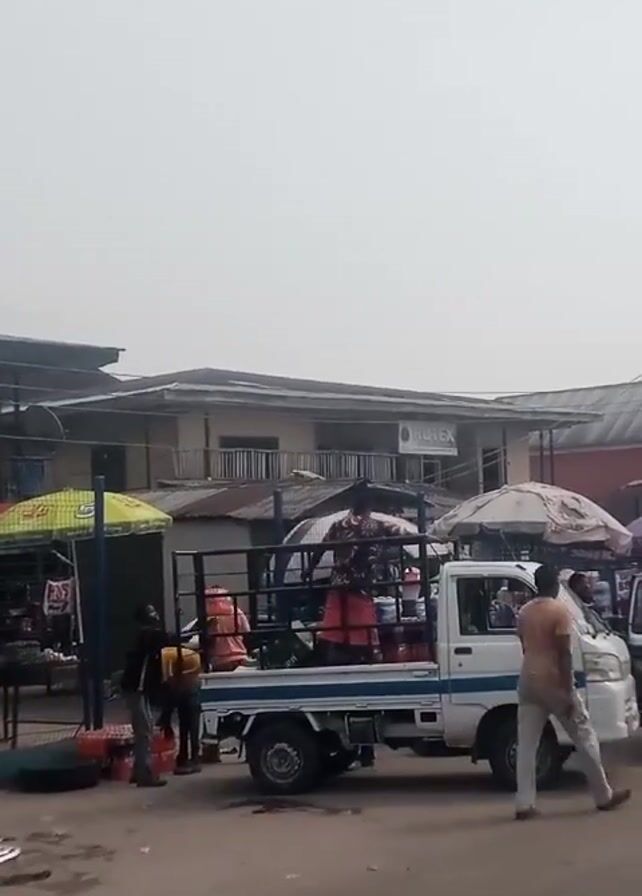 The video depicts a bustling street scene, presumably in a developing country. Several people are present, including pedestrians and motorcyclists. A white truck with a blue stripe is parked in the middle of the street. The truck bed is filled with various items, possibly goods for sale. Umbrellas are visible providing shade to vendors. Buildings line the street, some with corrugated metal roofs. The sky is overcast.