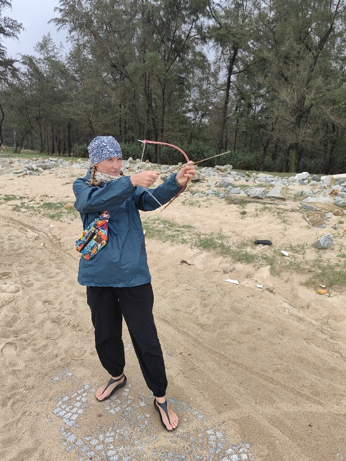 An adult female, appearing Caucasian, is depicted standing on a sandy expanse identified as Thuận An Ward, Vietnam, under an overcast sky. She is oriented slightly right of center, aiming a primitive bow and arrow directly forward. The subject wears a blue and white patterned beanie, a teal lightweight jacket, black casual pants, and black thong-style sandals. A colorful patterned fanny pack is secured across her chest. Her blonde hair is braided and visible beneath the beanie. Her hands manipulate a reddish-brown curved stick bow with a white string, and a thin, light-colored stick serves as an arrow, drawn back for release. The immediate ground is sand with sparse green vegetation. Scattered grey rocks and concrete debris are present in the midground to the right, along with incidental litter. A dense line of tall, slender evergreen trees forms the backdrop. Faint tire tracks are visible in the foreground sand.