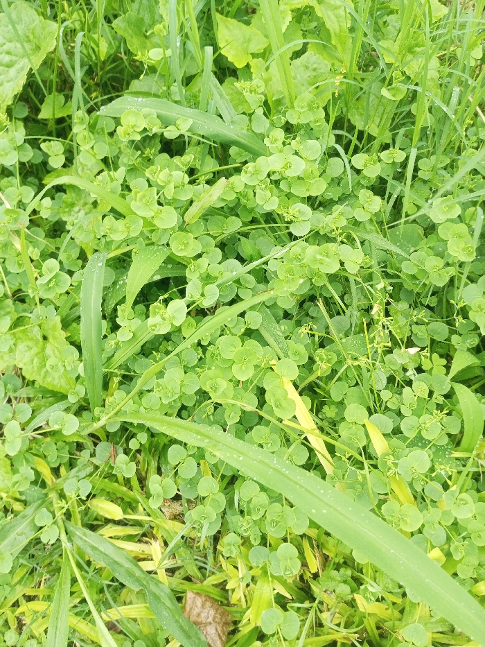 The image displays a dense, low-level ground cover of various green plant species, photographed in Irupalai, Sri Lanka. The scene is devoid of human presence or any man-made objects. The primary subjects are small, light green plants with numerous, nearly circular leaves, appearing to form a mat-like layer across the entire frame. Interspersed among these are taller, darker green blades of grass and other broader-leaved plants. Numerous small water droplets are visible on the surfaces of the leaves and grass blades, indicating recent precipitation or heavy dew. The vegetation appears healthy and vibrant, with a dominant green color palette. Lighting is even, suggesting an overcast sky or shaded conditions. The perspective is a top-down view, closely examining the natural ground flora.