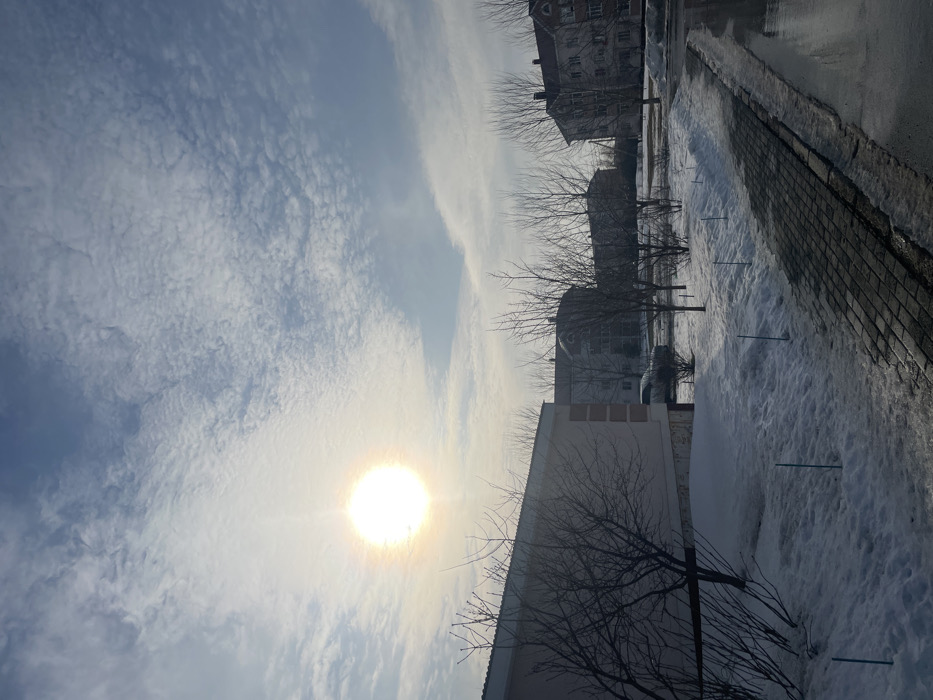 The image depicts an urban or suburban winter/early spring landscape in Tolyatti, Russia. The sky is bright blue, dominated by a brilliant, intense sun positioned slightly to the left of the image's vertical center. The sky is partially covered by numerous small, dappled white clouds, consistent with altocumulus or cirrocumulus formations. The foreground features a wet, dark grey paved pathway or sidewalk composed of rectangular interlocking pavers, originating from the bottom right corner and extending towards the middle left. To the left of this pathway, and across the midground, the terrain is covered by an irregular layer of snow, indicating partial melting. Several thin, light blue marker stakes are vertically embedded in the snow along the edge of the pathway. Numerous bare deciduous trees and shrubs, completely devoid of leaves, are scattered throughout the midground, reinforcing a late winter or early spring environmental context. On the far left, a light-colored, possibly beige or pale pink, single-story or low-rise building with a flat roof and some vertical wall accents is partially visible. In the mid-background, a white passenger vehicle is partially visible, parked. The background consists of several multi-story buildings, typical of residential or mixed-use structures in a Russian city. A prominent building on the right side features a dark, sloped roof and decorative gable elements. No individuals or specific activities are observable in the scene.