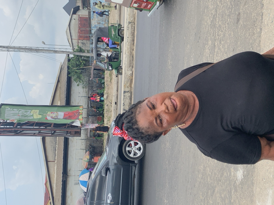 The image depicts a busy street scene in Aba, Abia, Nigeria, under an overcast sky