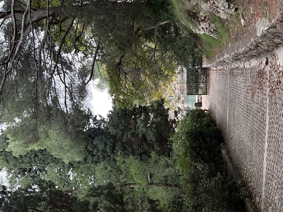 This image depicts a paved pathway leading towards a body of water, located within a densely vegetated area in Pržno, Montenegro. The pathway, constructed of dark-grey cobblestones, extends from the foreground and gently slopes downwards towards the distant water. Scattered brown autumn leaves are visible on its surface, particularly in the foreground. To the left of the path, a low stone curb borders a dense line of dark green, manicured bushes. Behind these bushes, tall evergreen trees, including cypress-like species, rise vertically, with a street lamp partially visible among them further back. To the right of the pathway, a stone retaining wall forms a boundary, with a narrow drainage channel running alongside the path. Beyond this wall, the terrain rises into a natural slope covered with wild grasses, smaller shrubs, and exposed rock formations. At the end of the pathway, a decorative dark-colored metal gate structure stands open, flanked by stone posts or low walls. Beyond this gate, a serene body of water, likely a bay or inlet, is visible with a distinct turquoise hue. The far side of the water reveals a rocky shoreline with additional trees and vegetation. The sky above is overcast, providing diffused lighting to the scene. No individuals or animals are present in the image.