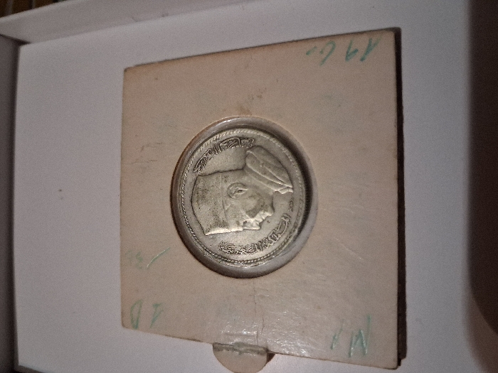 A close-up showcases a silver coin, likely of Middle Eastern origin based on its script, set within a square, light brown cardboard holder. The coin depicts a profile portrait surrounded by Arabic text. Green markings are visible on the cardboard, including the year "1967" and other characters. The coin and holder are situated inside what appears to be a white cardboard box.