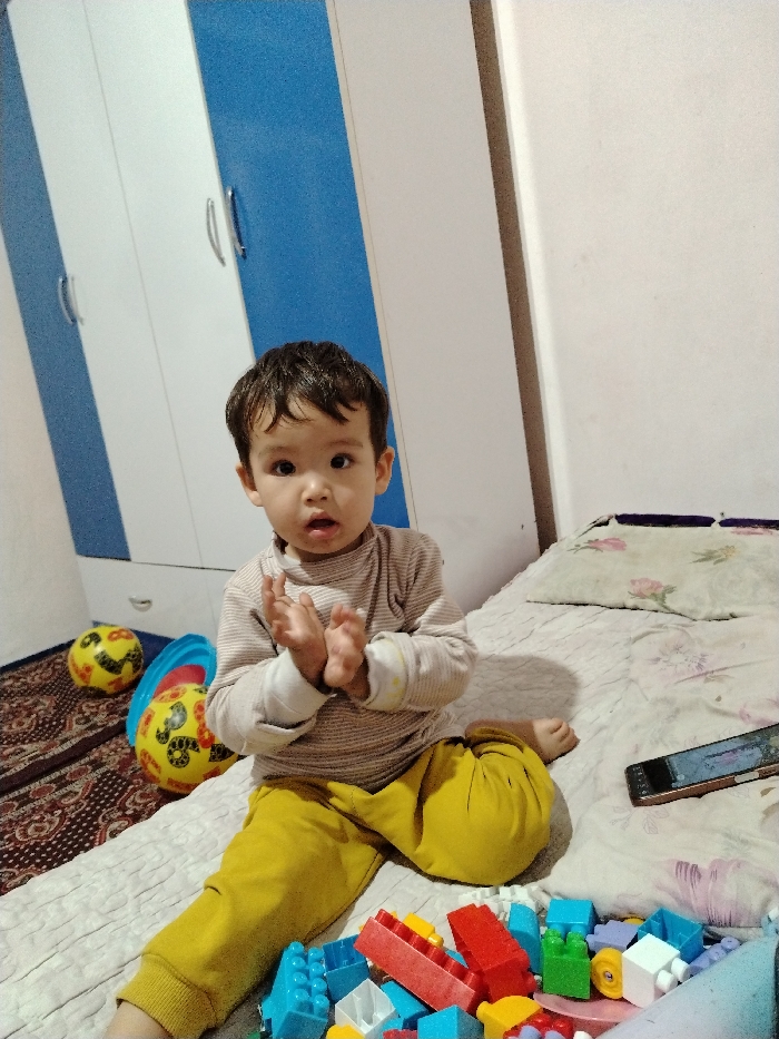 The image depicts an indoor scene in Beshbola, Uzbekistan. A young child, appearing to be a toddler, with dark hair and a light complexion, is seated on a bed in the foreground. The child wears a beige striped long-sleeved shirt and yellow pants. Both hands are raised, palms facing each other, in a clapping or gesturing motion, and the child looks directly at the camera with a slightly open mouth. To the child's right, on the bed, a black smartphone with an illuminated screen is visible. Directly in front of the child, a collection of colorful building blocks in shades of red, blue, green, yellow, and white are present. In the background to the left, a wardrobe with white and blue panels and silver handles stands against a light-colored wall. A patterned rug with red and brown tones is visible on the floor below the wardrobe. Two yellow and black toy balls and a blue and red plastic toy are positioned on this rug. The bed features a light-colored bedspread with a subtle floral or geometric pattern.