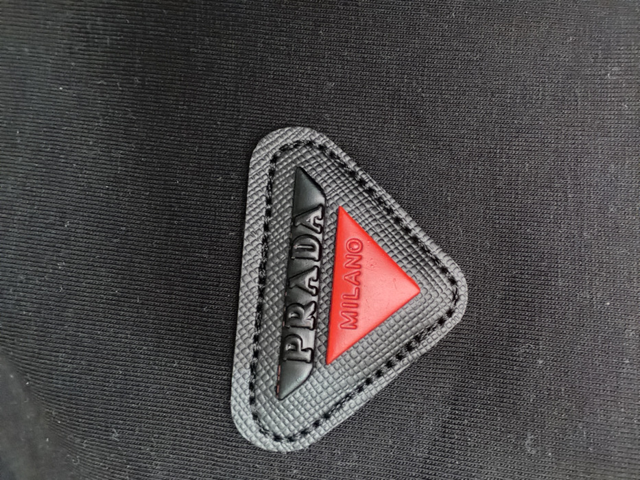 The image presents a detailed close-up of a black textile surface, characterized by a fine, diagonal ribbed texture. Centered in the lower half of the frame is an inverted triangular patch, constructed from a textured black material with a visible black stitched border. The precise dimensions of the patch are not determinable without a reference scale. The word "PRADA" is embossed in raised black capital letters across the upper section of this patch. Directly below, an inverted red triangular insert features the raised white capital letters "MILANO". No individuals, other objects, or actions are depicted. The visual evidence does not provide information to determine a specific location within the city of Saint-Étienne, France.