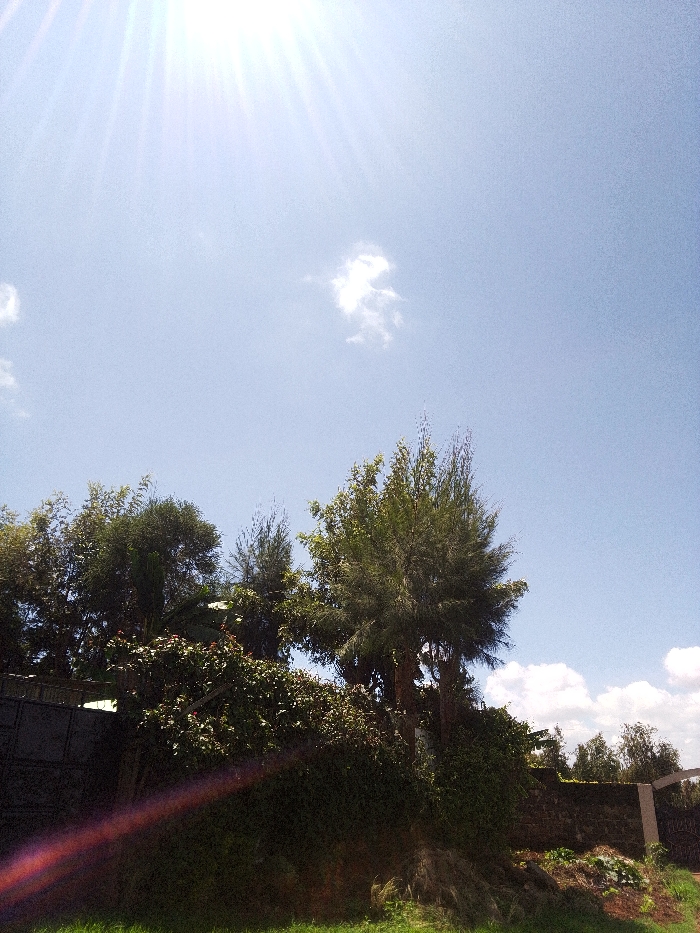 The image captures an outdoor environment in Nachu ward, Kenya, under a bright blue sky with sparse white cumulus clouds. The sun is positioned in the upper left quadrant, producing distinct lens flare and radial light rays. The lower portion of the frame is densely vegetated, featuring various trees with green foliage, including some with slender, spiky leaves, and a large bush with reddish-green leaves in the mid-ground. On the left side, a dark, solid structure, possibly a metal fence or gate, is partially visible behind the foliage. On the right, a stone wall, partially covered by vegetation, extends into the background, terminating near a lighter-colored gate post or frame. The immediate foreground consists of green grass transitioning to areas of dry vegetation and exposed soil near the base of the wall. No individuals, specific actions, or interactions are present.
