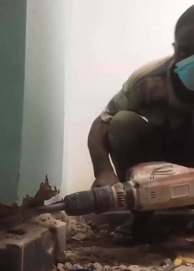 A person wearing a blue surgical mask, a striped shirt, and dark pants is squatting near a wall and using a jackhammer to break concrete. The person is holding the jackhammer with both hands. Debris and dust are on the floor around the person. A calendar hangs on the wall behind the person.
