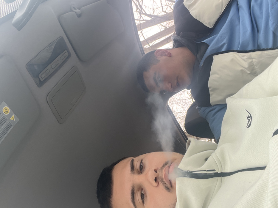 The image depicts two males inside a vehicle. The scene, asserted to be in Stara Zagora, Bulgaria, shows a light-colored car interior with an overhead console and partial view of a sun visor. Bare trees are visible through the window on the right side of the vehicle. The foreground subject, a male with short dark hair, a mustache, and stubble, wears a light cream/pale green hooded sweatshirt featuring a dark zipper and a "Nike" logo. He is exhaling a plume of white vapor from his mouth. His gaze is directed towards the camera. The background subject, also a male with short dark hair, is partially visible to the right and slightly behind the foreground subject. He is wearing a blue long-sleeved garment layered under a two-tone jacket, light cream/white on top and dark blue/black on the bottom. He appears to be looking towards the foreground subject with his mouth slightly open, suggesting speech or a reaction to the vapor.