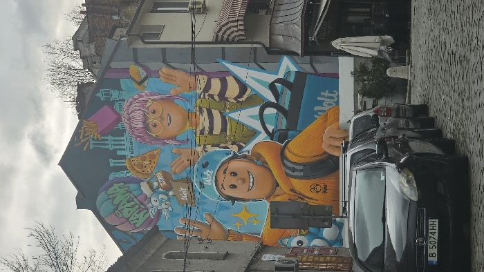 - "An outdoor, daytime image displays a vibrant street mural dominating the side of a multi-story building in the Kapana district of Plovdiv, Bulgaria, under an overcast sky" by FM-3Nx4j2, licensed under CC BY 4.0