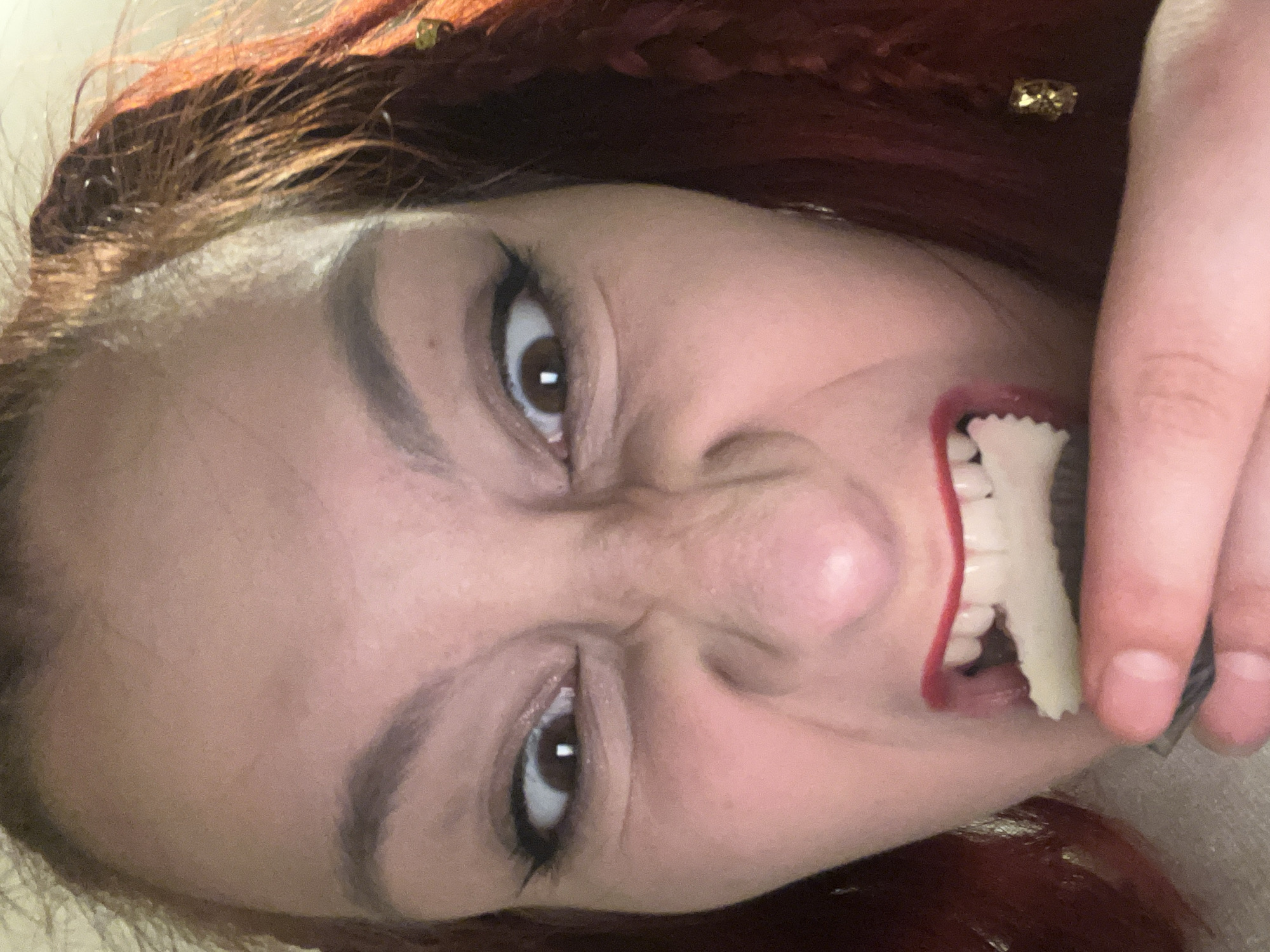 A low-angle portrait shows a person with reddish-brown hair, decorated with small gold beads in braids. They are making an angry face, their eyes wide and eyebrows furrowed. The person is holding a pale yellow, jagged-edged object between their teeth, framed by red lipstick. The location is not identifiable in the image.