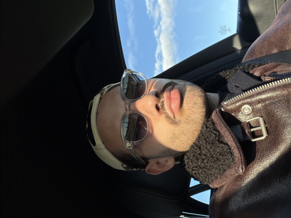 The image displays a male individual seated in the front of a vehicle, in what appears to be the driver's position, located in Enghien, Belgium. The subject's face, characterized by light skin, dark hair, a dark mustache, and a dark stubble beard, is partially illuminated by direct sunlight from the right. He wears clear-framed sunglasses with dark lenses, which reflect a segment of open road and distant vegetation beneath a blue sky. A light-colored baseball cap is worn backward on his head. He is dressed in a dark brown leather jacket with a dark, textured, possibly shearling, collar, over a dark undergarment. A dark seatbelt is secured across his chest. The vehicle's interior features dark upholstery. Outside the vehicle's right-side window, a clear blue sky with scattered white clouds is visible.
