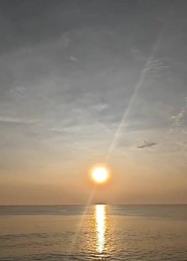sun rising over the ocean. The sky is mostly overcast with hints of blue peeking through, and there's a bright beam of sunlight cutting across the sky. The sun is low on the horizon, casting a shimmering reflection across the water. The ocean appears calm.