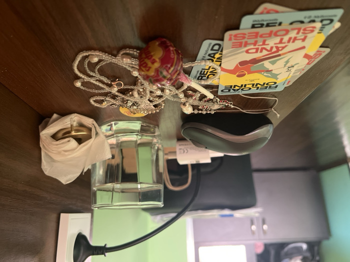 The scene depicts an indoor environment on a dark brown wooden surface in Govedartsi, Bulgaria. In the foreground, a stack of "RELOAD ONLINE" ski-themed promotional cards lies on the left, next to a collection of tangled white beaded jewelry and a small, multi-colored oval decorative object. To the right, a gray and black wireless computer mouse is present, followed by a clear, faceted glass containing clear liquid. A brass-colored cylindrical item, partially wrapped in white tissue paper, is positioned further right. In the mid-ground, a white power adapter is visible behind the mouse, and a black power cord is plugged into a white wall socket on a dark brown panel, extending towards a black articulated lamp arm. The background features a dark brown cabinet against a light green wall and a partial view of a window. No individuals are present, and all objects are static.