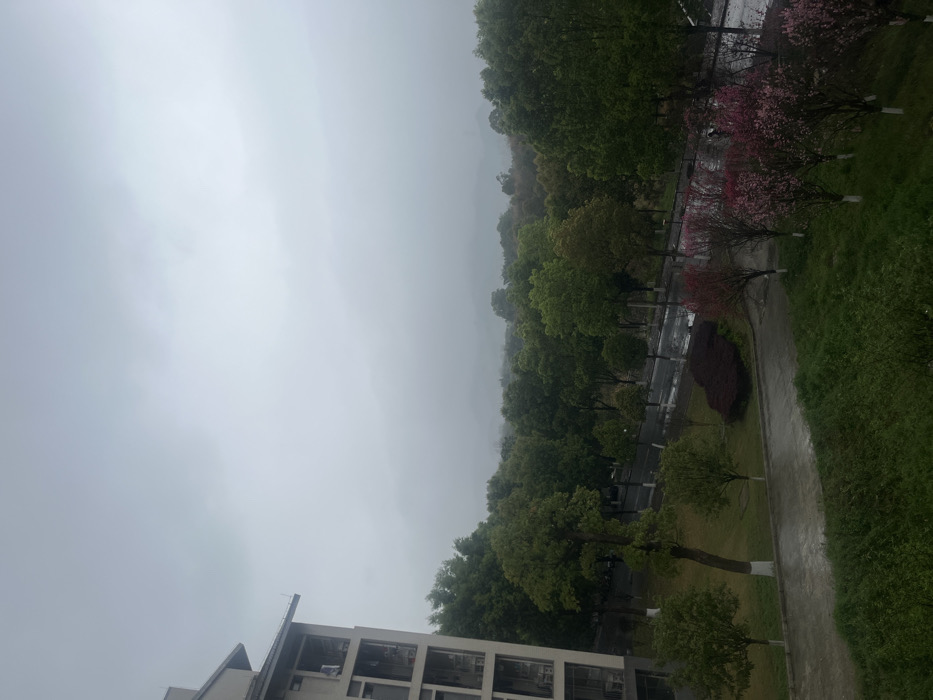 This image depicts an elevated outdoor view in Jiangjin, China, under overcast conditions with visible atmospheric haze. The scene is dominated by a dense expanse of trees with varying shades of green foliage, suggesting spring or early summer. In the foreground, a grassy slope leads to a paved pathway, bordered by several small trees displaying vibrant pink and reddish-purple blossoms. Further back, a dark, wet asphalt road curves through the midground, reflecting light from its wet surface. A single, darkly-clad individual is discernible walking on this wet road in the mid-right portion of the frame, partially obscured by trees. On the far left, a portion of a multi-story building is visible. It features light-colored exterior walls, multiple rectangular windows, and balconies. A small, thin antenna-like structure extends horizontally from its upper roofline. In the background, a distant treeline transitions into indistinct, hazy mountains, largely obscured by the low cloud cover and mist. The sky is uniformly light gray, indicative of heavy overcast conditions. The overall environment appears damp, consistent with recent rainfall or high humidity. No other subjects or interactions are clearly visible.