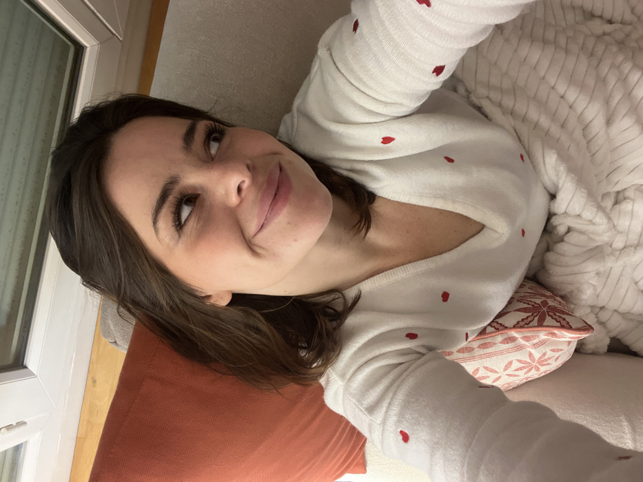 A woman smiles, looking up and to the left. She has brown hair and fair skin, wearing a white v-neck sweater with tiny red hearts. She is resting on several pillows; one is orange, and another has a geometric design with red floral motifs. A white, textured blanket is also visible. A window frame appears on the left. The photo seems to be taken from a high angle, close to the woman's face.