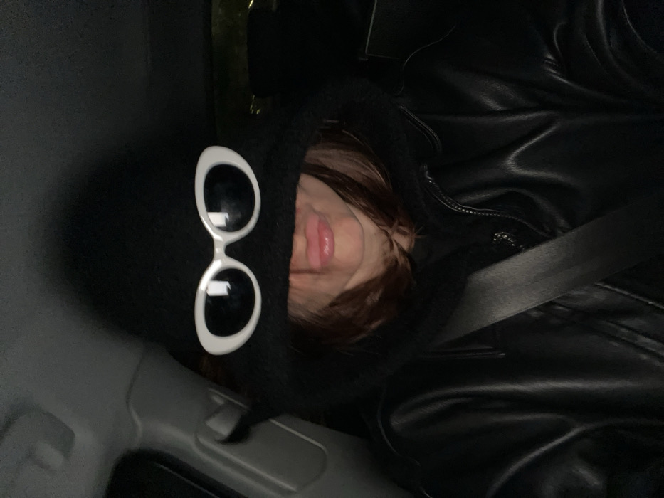 person wearing a black beanie with white, round-framed sunglasses perched on top. Only the person's lips and hair are visible under the beanie. The person is wearing a black leather jacket and a seatbelt. The image is taken from a slightly downward angle. The interior of what appears to be a car is visible in the background.