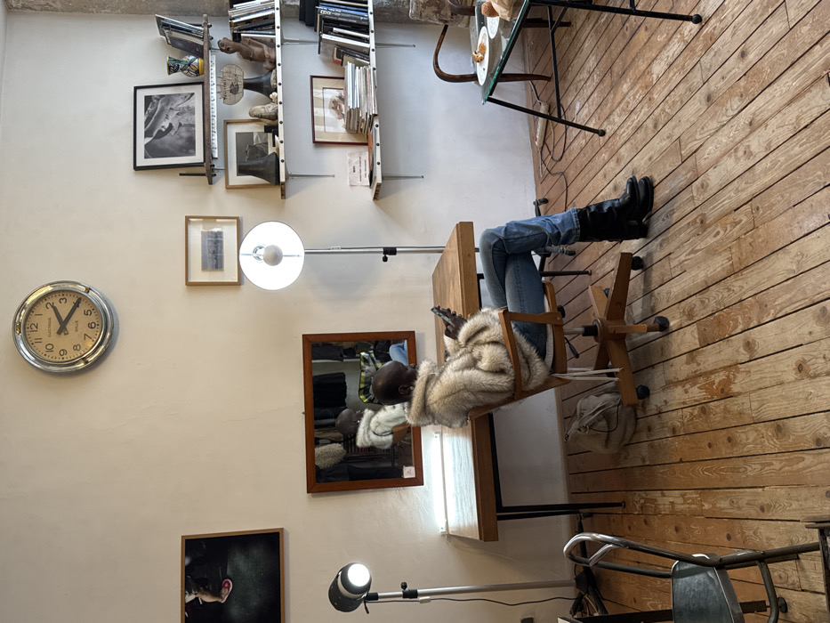 This image depicts an interior scene, likely a studio or creative workspace, located in the city of Paris, France. A person with dark skin and a closely shaved head is seated in a brown wooden swivel office chair, angled to the viewer's left. They wear a light-colored, possibly faux fur, jacket, blue jeans, and dark boots. Both hands hold a dark smartphone, which they are actively looking at. The person is positioned at a dark wooden rectangular desk with black metal legs. A horizontal fluorescent light fixture is attached to the desk's underside, illuminating the workspace. Behind the desk, a rectangular mirror with a wooden frame hangs on the wall, reflecting the person's back and what appears to be a clothing rack. To the left of the desk, a professional studio light on a silver stand directs a bright beam of light towards the scene. Another studio light, equipped with a circular white diffuser, stands on a silver tripod to the right of the desk. The walls are light-colored. High on the left wall, a framed artwork featuring a dark background and a reddish, foot-like object is visible. Above the desk, a large, round, chrome-rimmed wall clock with a cream face and black numbers shows approximately 1:50, bearing the inscription "ELECTRIQUE BELLE." On the right wall, three white floating shelves display a collection of objects. The top shelf holds a framed black and white photograph, a colorful patterned vase, and several books. The middle shelf features various sculptural items, including dark, bell-shaped objects, busts, and more books. The bottom shelf contains stacks of papers or magazines, additional books, and a small white card. To the far right, a small glass-topped table with black metal legs holds a white plate with pastry remnants and a crumpled paper bag. Behind this table, a classic wooden chair with a curved back is positioned. The floor throughout the room consists of light-colored, worn wooden planks. In the bottom left, part of a dark metal chair with a green seat is visible. A light-colored bag rests on the floor beneath the desk.