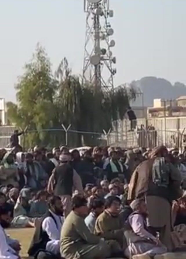 crowd of men, many wearing traditional Afghan clothing, gathered outdoors