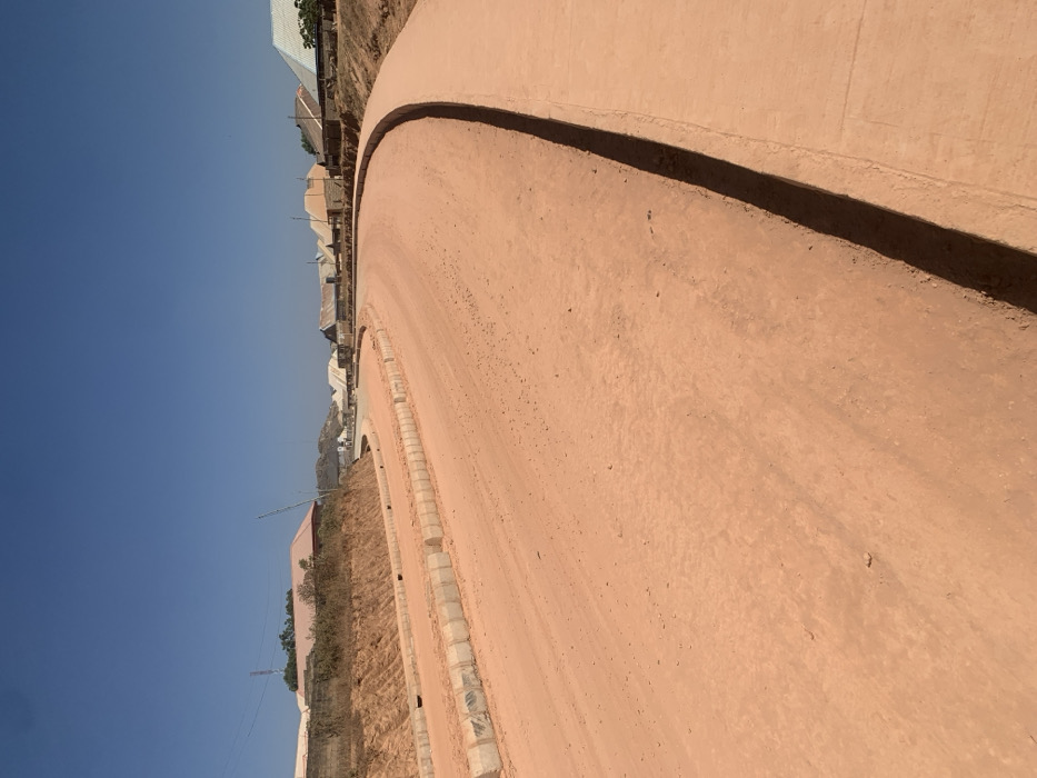 This forensic description details an image depicting an unpaved road in Bukuru, Nigeria, under a clear blue sky. The central feature is a wide, reddish-brown dirt road, curving gently to the right and extending into the distance. Faint tire tracks are discernible on its surface. Along the left edge of the dirt road, a series of light grey concrete curb blocks form a low barrier, likely for drainage. Beyond these blocks, an earthen embankment rises, topped by scattered dry vegetation and several single-story buildings with varied roof types (red, light grey). Further in the background on the left, an antenna tower with visible wires stands against the sky. On the right edge of the dirt road, a smooth, lighter-toned concrete pathway or sidewalk runs parallel, also curving to the right. This pathway appears recently constructed. A sharp, dark shadow delineates the boundary between the dirt road and this paved section. Beyond the paved path, a row of single-story buildings with corrugated metal and light-colored roofs lines the roadside. No individuals, animals, or active vehicles are present within the frame. The scene is illuminated by bright daylight, casting distinct shadows and highlighting the reddish hue of the earth. The overall impression is of an area undergoing infrastructure development or recently graded for such.