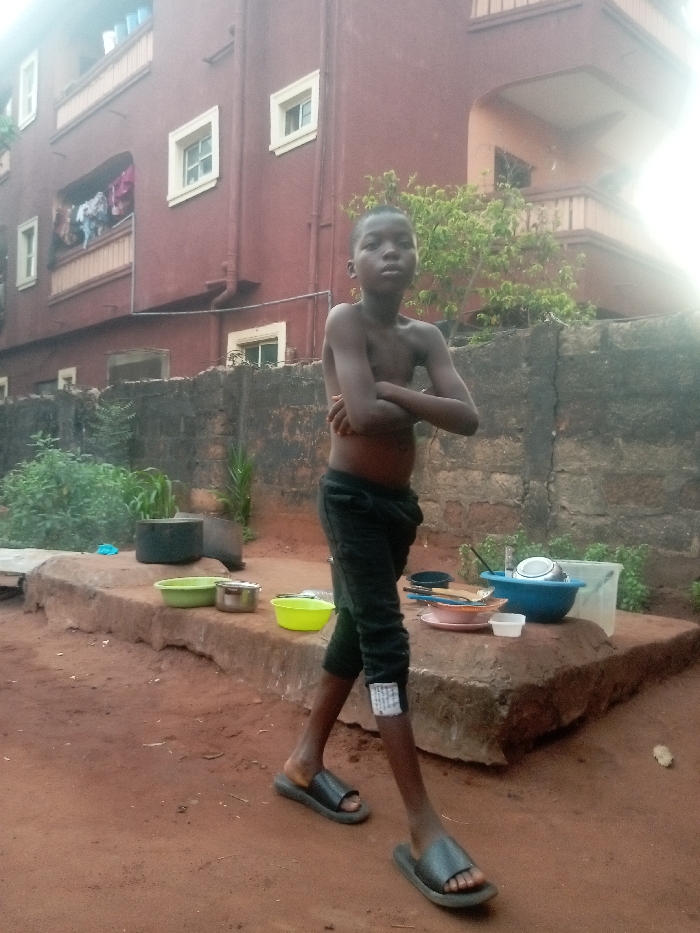 This image depicts an outdoor scene in Ogidi, Nigeria. In the foreground, a young male individual, appearing shirtless, stands facing forward with arms crossed over his chest, looking directly at the camera. He wears dark-colored athletic trousers or sweatpants and black slide sandals. A small white rectangular patch is visible on his lower right leg. The ground is composed of reddish-brown earthen soil. Behind the individual, a low, rough, reddish-brown concrete or earth-built raised platform extends horizontally across the midground. On this platform, from left to right, are two green plastic bowls, a silver metal pot, and a yellow-green plastic bowl. Further to the right on the platform, a collection of items includes a blue plastic basin containing metal and ceramic dishware, a clear plastic jug, a pink ceramic plate, and various small utensils. A large, dark cooking pot rests on the ground to the left, behind the platform. Behind the platform is a weathered, dark grey or black block wall. Sparse green foliage and shrubbery are visible in front of and behind sections of this wall, with a small tree apparent on the right. In the background, a three-story building, painted a dark reddish-brown, features multiple white-framed windows. Two balconies are visible; laundry is hanging over the railing of the lower-left balcony. The scene is illuminated by natural daylight, with a bright area in the upper right quadrant suggesting direct sunlight.