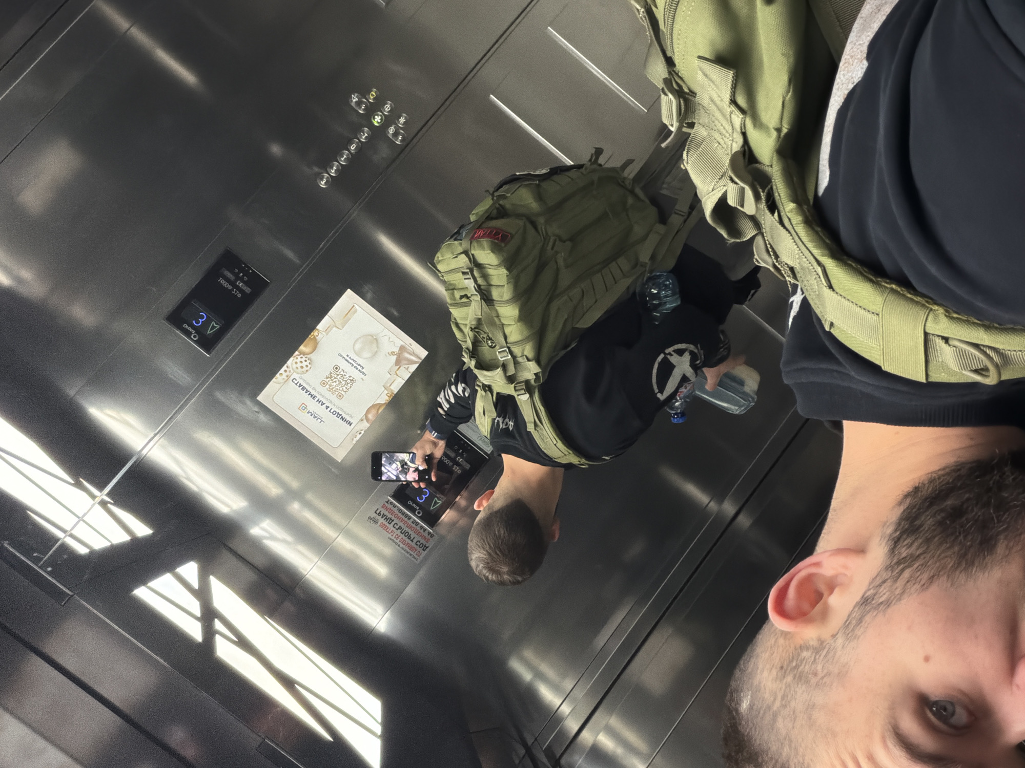 A man takes a selfie in an elevator. He's wearing a black sweatshirt with a white circular logo on the chest and a green tactical backpack. He is holding a phone in his left hand, showing a photo of a woman on the screen. The elevator panel shows the current floor is 3. There is a sign on the wall with the word "JAM" on it, along with additional text in Bulgarian and English. The background shows the interior of the elevator, which has brushed metal walls. The photo was taken in Pernik, Bulgaria.