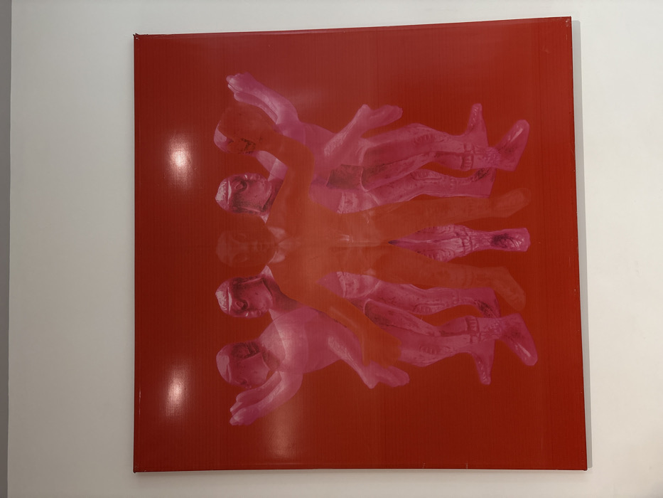 An artwork is prominently displayed on a clean white wall in San Andrés Cholula, Mexico. The piece is a rectangular, horizontally oriented print or painting with a glossy surface, measuring approximately square in dimension. The background is a vibrant, solid red, exhibiting subtle horizontal striations. Five stylized, human-like figures are depicted in an overlapping arrangement across the red background. The central figure is a translucent orange-red, facing forward with outstretched arms, resembling a male form with an alien-like head. Flanking this central figure are four additional figures in a translucent pink-magenta hue, also in dynamic poses with raised arms and what appear to be masked or helmeted heads. These figures resemble plastic action figures or mannequins, featuring defined musculature and segmented body parts. Two distinct bright reflections from overhead light sources are visible on the upper portion of the artwork's glossy surface. The artwork is flush-mounted against the wall.