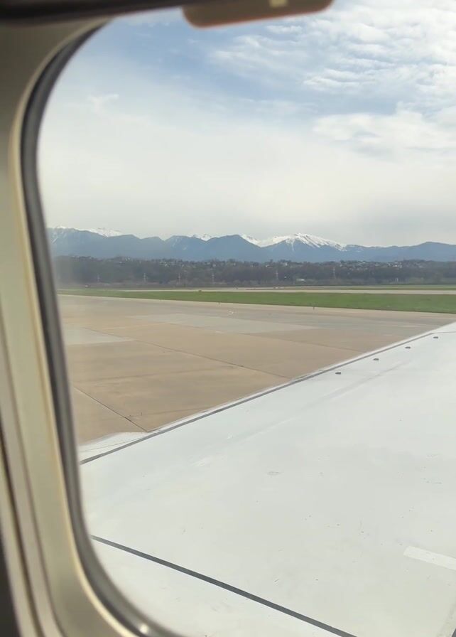 view out of an airplane window. A wing of the plane is visible in the foreground, with a runway and green fields beyond it. In the distance, there are mountains with snow-capped peaks. The sky is cloudy with patches of blue. The plane is on the ground.