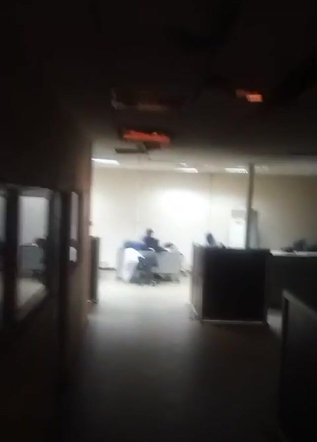 dimly lit hallway leading into an office space. The office area is brighter, illuminated by ceiling lights. There appear to be two people working at desks in the office. There is an air conditioning unit visible in the background. The hallway is lined with dark cabinets and possibly mirrored surfaces. The video is somewhat shaky and the image is not perfectly clear.