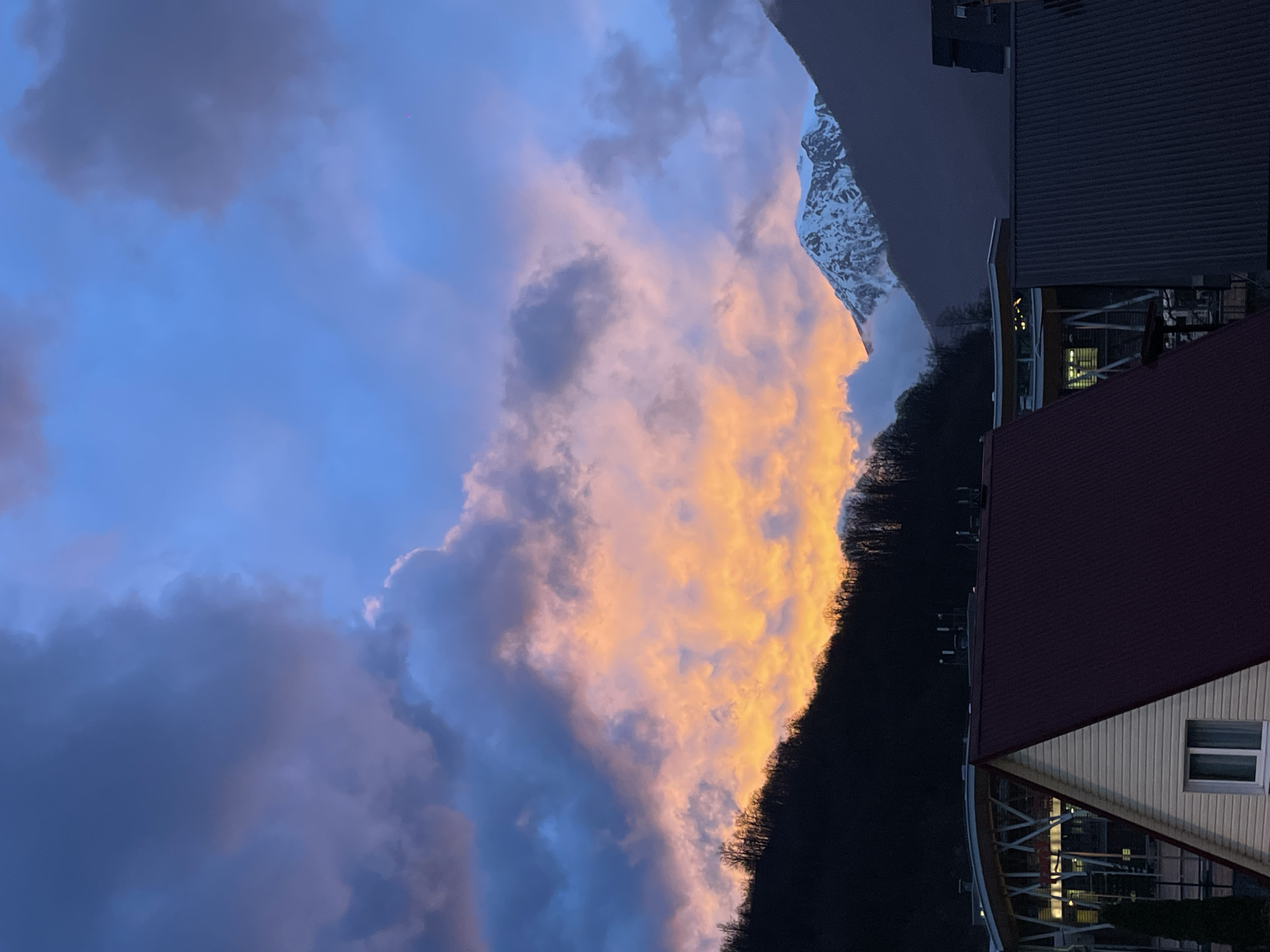 view in Estosadok, Russia, featuring a landscape with buildings and a mountain range. The sky dominates the upper portion of the image, displaying a mix of blue and dark, stormy clouds. A large, prominent cloud formation is illuminated with a warm, orange hue, likely from the setting or rising sun. Below the sky, a dark, forested area covers the midground, sloping upwards towards a mountain peak. The mountain is partially covered in snow, suggesting a high altitude. In the foreground, a building with a dark red roof and white siding is visible. The building appears to be modern in design, with angular lines and large windows. To the right of this building, another structure with dark siding and a metal roof is present. No people are visible in the image.