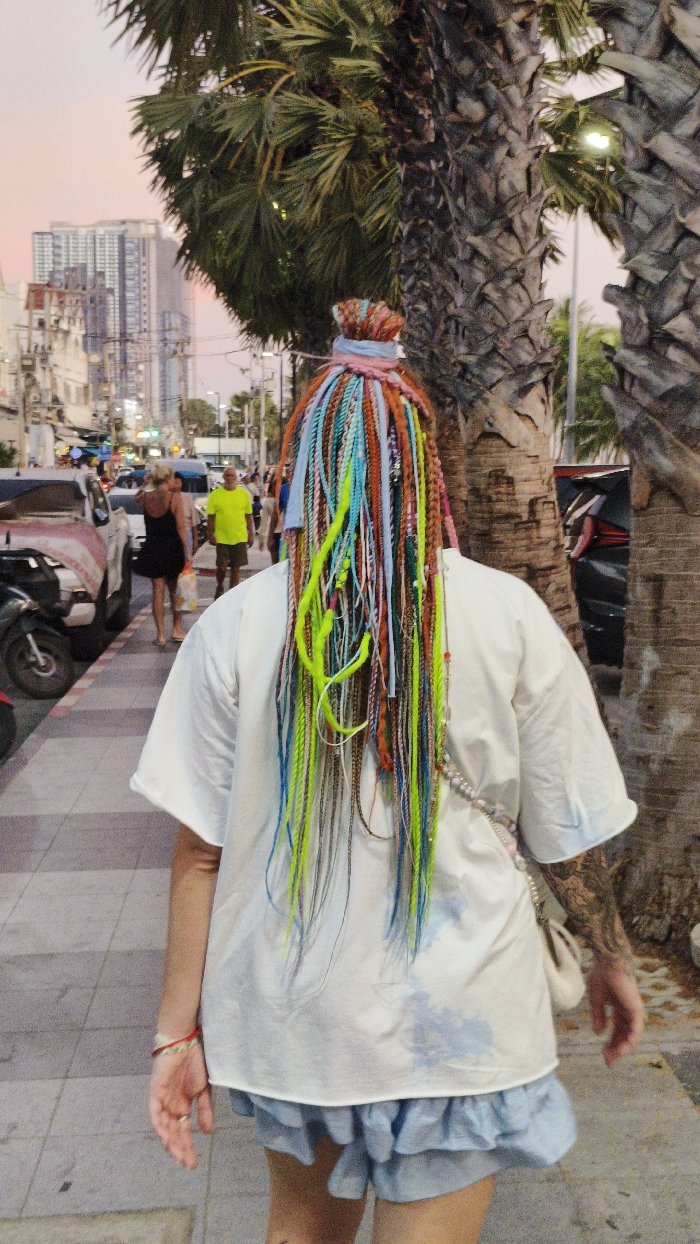 The image displays a street scene in Pattaya City, Thailand, during the early evening or dusk. The primary subject is a person, viewed from behind, walking forward on a paved sidewalk. This individual features long, multi-colored synthetic hair, composed of numerous braids and dreadlocks in shades of blue, lime green, orange, pink, and brown, partially secured in a high bun with a light pink and blue fabric wrap. The person wears a loose white short-sleeved top with light blue dye stains and light blue ruffled shorts. A light-colored shoulder bag is visible on the right side, along with a beaded strap across the right shoulder. A red and white bracelet is present on the left wrist, and a dark-inked tattoo is visible on the right arm. To the right, large palm trees with rough, textured trunks line the sidewalk. To the left, a street contains parked vehicles, including a white pickup truck and a motorbike. Other pedestrians are visible in the midground, specifically a woman in a black dress and a man in a bright yellow shirt. The background features a collection of commercial buildings and distant high-rise structures, silhouetted against a sky showing pink and orange sunset hues. Utility poles and overhead wiring are visible throughout the street environment.