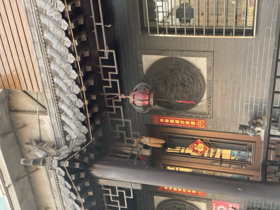 The image displays a detailed street-level exterior view of a building in Taihe District, China, exhibiting traditional Chinese architectural elements and festive decorations. The building features a dark gray tiled roof with ornate eaves, including a decorative finial on the top left corner. Below the eaves, a dark-colored lattice pattern is visible. The facade is constructed from dark gray bricks. A prominent dark pillar stands on the left, supporting the overhanging roof structure. A red and dark-colored Chinese lantern, adorned with a red tassel, hangs from the eaves towards the right. To the left of the main entrance, two dried corn cobs are suspended. The entrance consists of a double wooden door with multiple glass panels, reflecting ambient light. Affixed to one of the door's glass panels is a red diamond-shaped paper decoration featuring the inverted Chinese character "福" (fú). The door is flanked by two vertical red banners with gold Chinese characters; the right banner reads "新春喜订菓". Mounted on the brick wall are two large circular bas-reliefs. The one on the right is clearly visible, depicting a complex design of what appears to be a mythical creature, possibly a dragon, within a decorative circular frame. To the far right, a window with horizontal metal security bars is present. In front of the building, a dark-colored metal railing runs across the lower portion of the frame. Two small, gray stone statues, resembling guardian lions or Foo Dogs, are positioned on a ledge behind the railing. A small, partially obscured red and white sign with a "no" symbol is visible on the far left. No individuals are present in the scene.