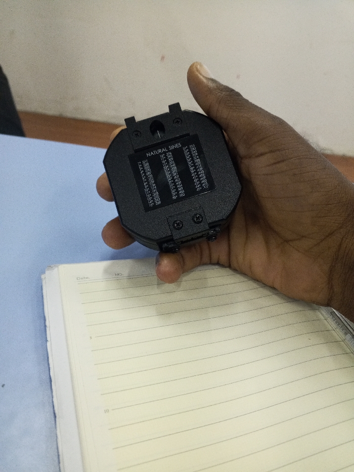 A person is holding a black, round object with a table of natural sines printed on its surface. The table displays angles and their corresponding sine values. The object has screws on its surface. Below the hand is a notebook with lined paper and the words "Date." and "NO." are visible in the top left corner of the page. The notebook's pages are a light tan color and the table is light blue.