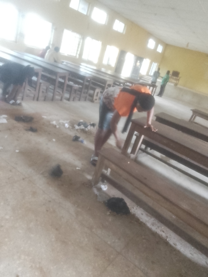 The image captures the interior of a large, likely institutional, hall in Nsugbe, Nigeria, possibly a classroom or lecture hall. Numerous wooden benches with attached desks are arranged in rows throughout the space. The light-colored floor is heavily soiled with scattered debris, including dirt, paper scraps, and other refuse. Four individuals are present. In the mid-foreground, a person wearing an orange top over a patterned shirt and dark shorts is bent over, their right hand resting on a wooden bench, appearing to clean the floor. To their left, another individual dressed in dark clothing is similarly bent over near a pile of debris. In the background, a person in a light-colored top is seated at a desk. Two additional figures are visible standing towards the rear of the hall. Bright natural light illuminates the scene, entering through multiple large rectangular windows on the far wall.