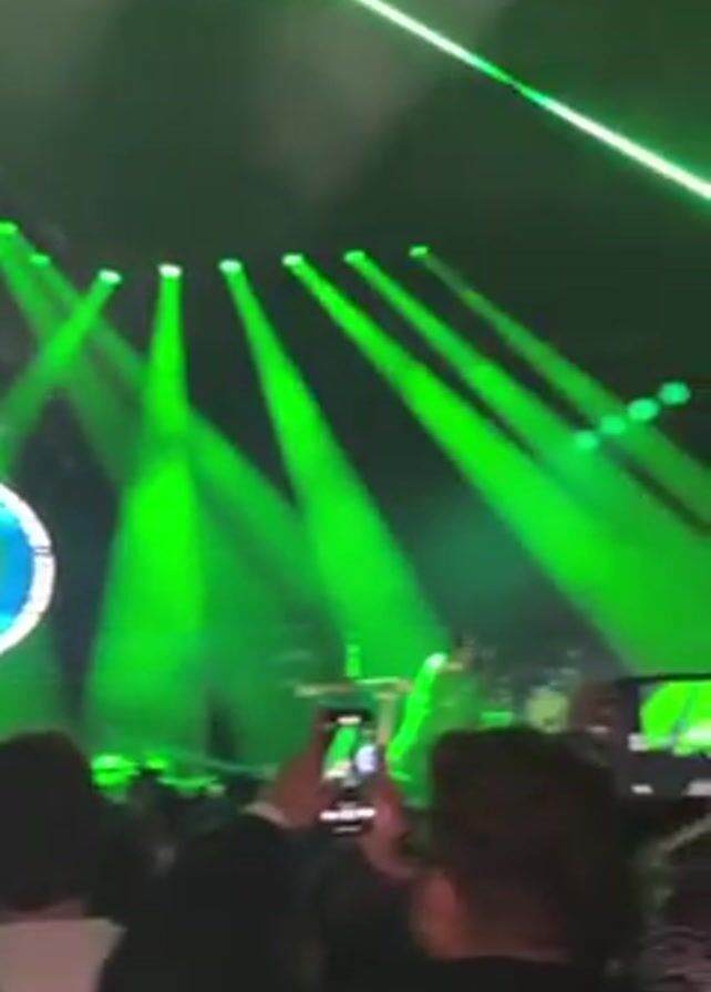 band performing on a stage illuminated by green spotlights. The band’s logo, a stylized “D” inside a circle, is displayed prominently on a screen behind them. A crowd of people is visible in the foreground, holding up their phones to record the performance. The environment appears to be a concert venue.